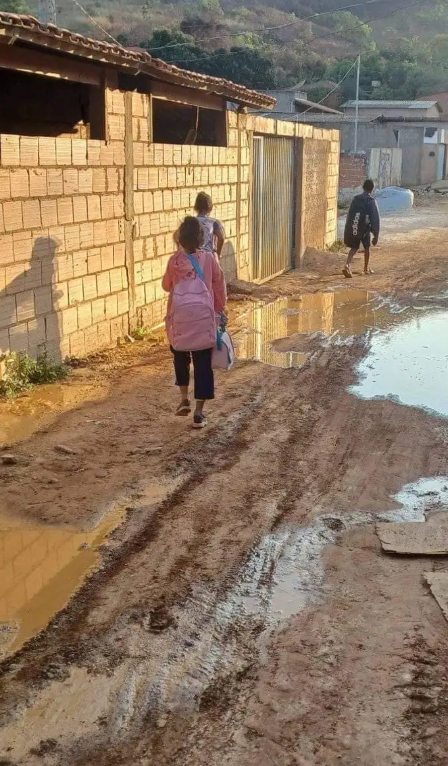 Crianças que vão para a escola passam por ruas esburacadas e cheias de lama, e isso antes mesmo da temporada de chuvas começar.