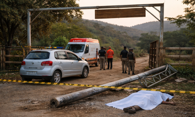 Estrutura metálica instalada sobre portão se desprende durante manobra de rotina, atinge trabalhador rural e mobiliza Polícia Militar, Bombeiros, Samu e perícia técnica.
