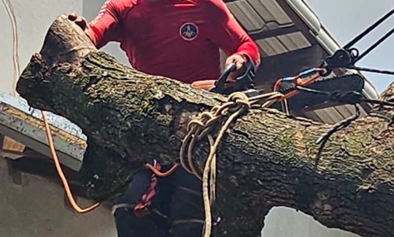 Árvore seca cede após chuva da madrugada, atinge muro e telhado de imóvel e mobiliza duas equipes do Corpo de Bombeiros para operação com técnicas de salvamento terrestre.