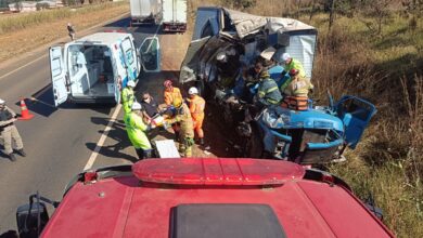 Motorista fica preso às ferragens após colisão entre caminhonete e carreta em estrada molhada perto de Patrocínio