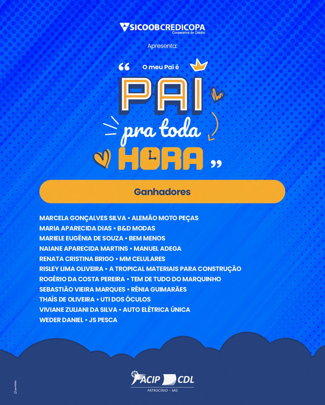A campanha “Meu Pai é Pai pra Toda Hora”, realizada pela ACIP/CDL entre os dias 1º e 20 de agosto, premiou diversos consumidores que apostaram no comércio local. Ao longo da ação, clientes que compraram em empresas participantes foram contemplados com vales-compras para utilizarem nas próprias lojas da cidade.
