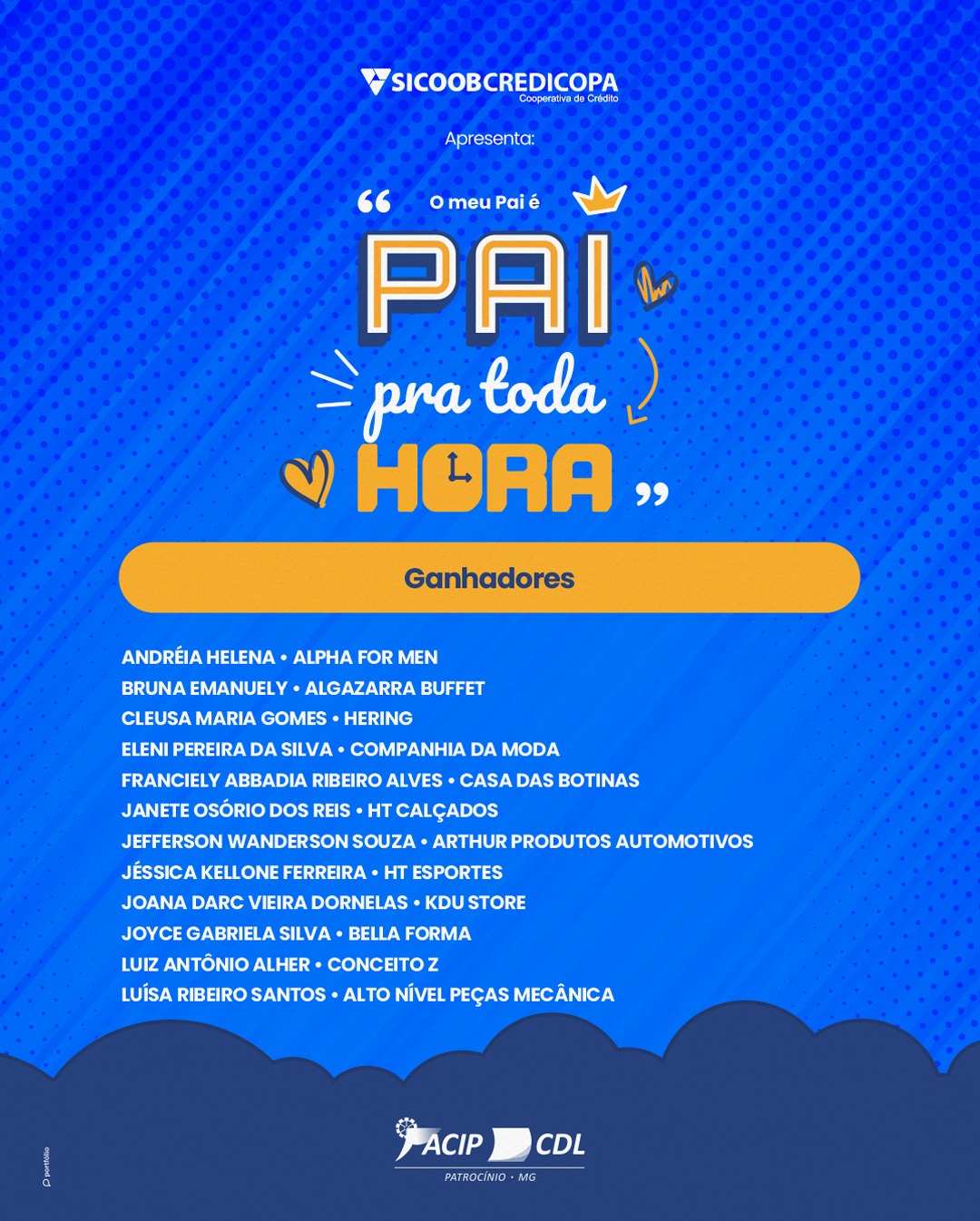 A campanha “Meu Pai é Pai pra Toda Hora”, realizada pela ACIP/CDL entre os dias 1º e 20 de agosto, premiou diversos consumidores que apostaram no comércio local. Ao longo da ação, clientes que compraram em empresas participantes foram contemplados com vales-compras para utilizarem nas próprias lojas da cidade.