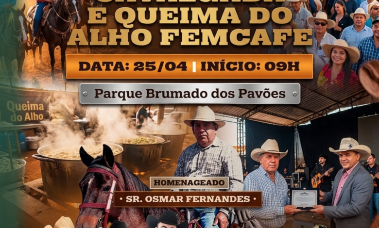 A tradição do campo vai abrir oficialmente a programação da FemCafé 2026 no dia 25 de abril, em Patrocínio. A Cavalgada e a tradicional Queima do Alho estão previstas para ocorrer no Parque de Exposições Brumado dos Pavões, reunindo cavaleiros, comitivas e admiradores da cultura sertaneja.