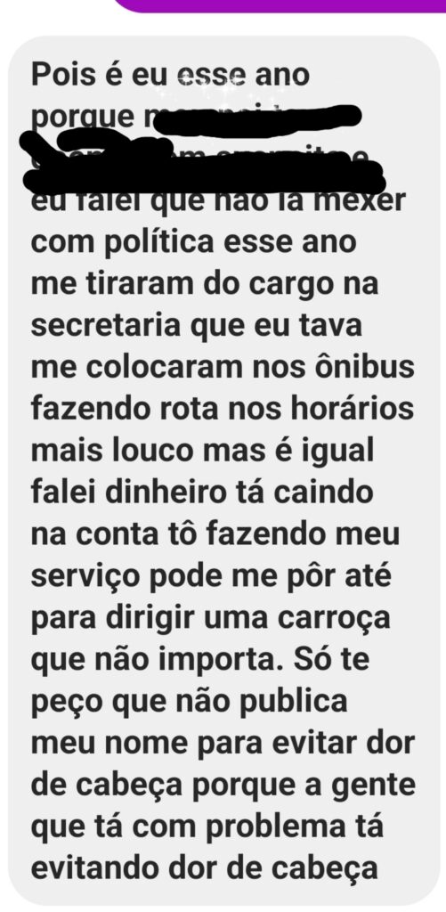 “Os funcionários da secretaria de obras tá vivendo um terror, e outra, não quer dizer que quem apoiou o Deiró é obrigado a apoiar os cara”, afirmou o servidor.