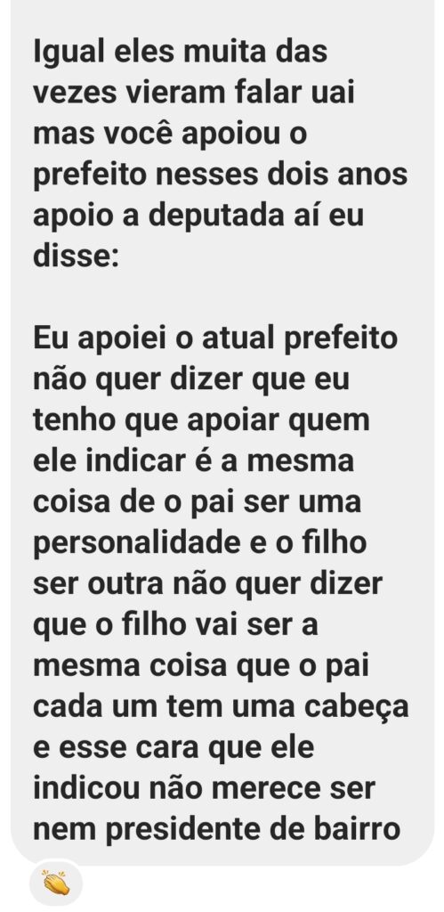 “Eu apoiei o atual prefeito, não quer dizer que eu tenho que apoiar quem ele indicar. É a mesma coisa de o pai ser uma personalidade e o filho ser outra; não quer dizer que o filho vai ser a mesma coisa que o pai”, desabafou um funcionário.