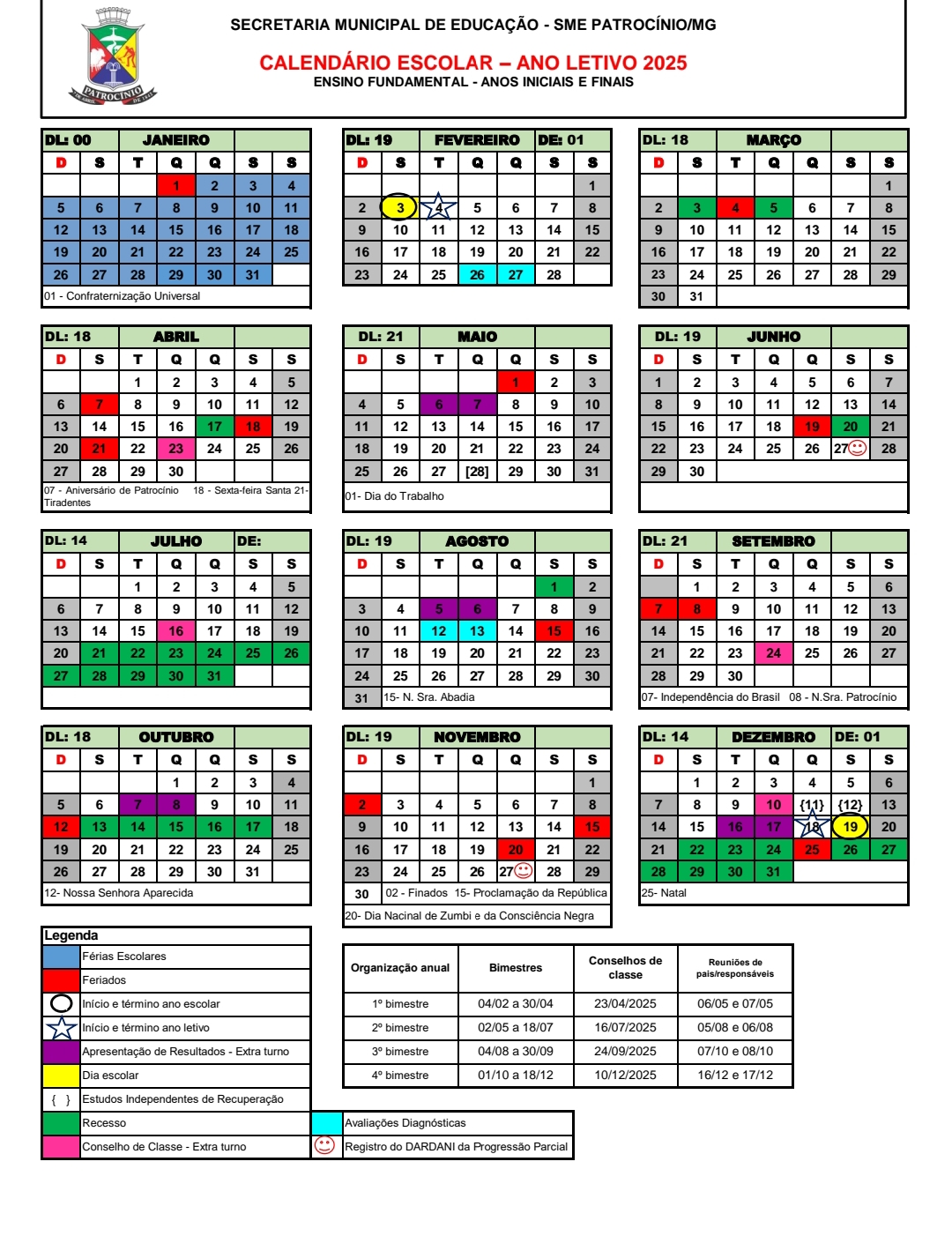 A Secretaria Municipal de Educação de Patrocínio divulgou o calendário escolar de 2025 para o ensino fundamental – anos iniciais e finais. O ano letivo teve início no dia 3 de fevereiro, com previsão de 200 dias letivos, encerrando em 18 de dezembro.