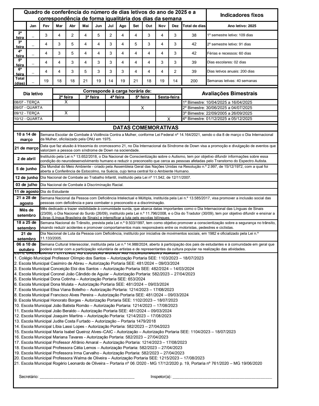 O calendário também organiza os períodos de avaliações, conselhos de classe e reuniões com os pais e responsáveis. O planejamento visa garantir um ano letivo bem distribuído, com tempo adequado para o ensino e também para o descanso dos alunos e profissionais da educação.