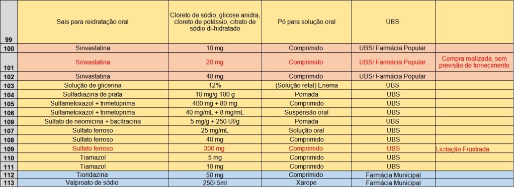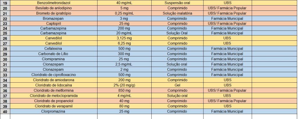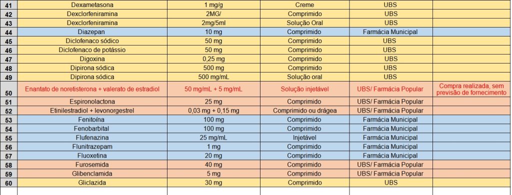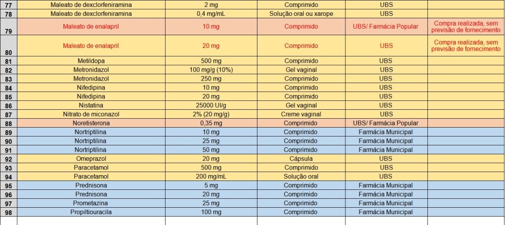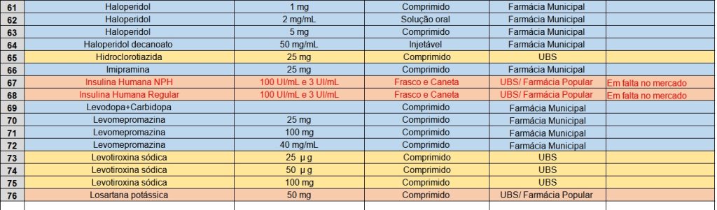 Para facilitar a consulta, os medicamentos foram organizados por cores: azul (Farmácia Municipal), amarelo (UBSs), laranja (UBSs e Farmácia Popular) e vermelho (temporariamente fora de estoque). A ferramenta permite que usuários do sistema evitem deslocamentos desnecessários e se organizem melhor quanto ao uso contínuo de tratamentos.