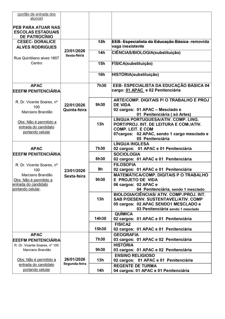 A Superintendência Regional de Ensino de Patrocínio divulgou o cronograma oficial de contratação presencial para o ano letivo de 2026, contemplando vagas excepcionadas do processo online na rede estadual de ensino do município.