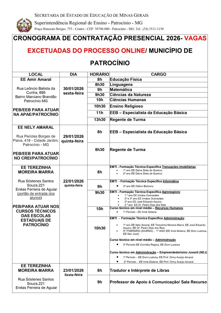 A Superintendência Regional de Ensino de Patrocínio divulgou o cronograma oficial de contratação presencial para o ano letivo de 2026, contemplando vagas excepcionadas do processo online na rede estadual de ensino do município.