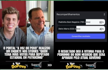 Uma enquete publicada nos stories do portal A Voz do Povo Patrocínio indicou vantagem do pré-candidato a deputado estadual Pedrinho do Bom Negócio, aliado do atual grupo político. No levantamento, ele apareceu com 797 votos (60%), contra 531 votos (40%) atribuídos a Deiró Marra, em um total de 1.328 participações.