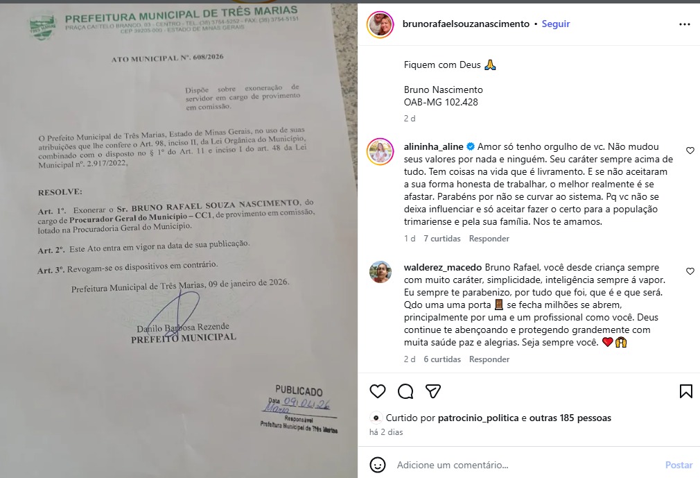O ex-procurador-geral do município de Três Marias, Bruno Nascimento, tornou pública uma carta aberta dirigida ao prefeito, vice-prefeito, secretários e à população na qual comenta sua exoneração do cargo e faz acusações diretas sobre a condução administrativa da gestão municipal.