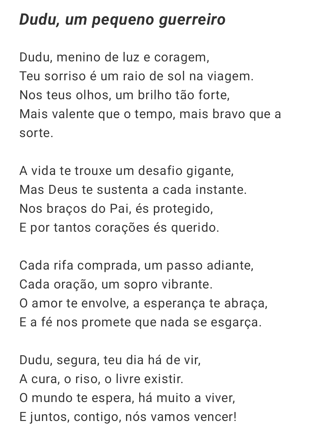 Que Ele renove suas forças, multiplique os recursos necessários e cubra o pequeno Dudu com Sua graça e proteção.