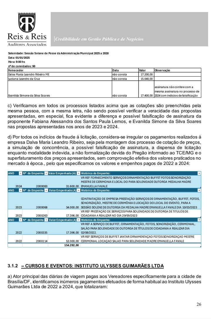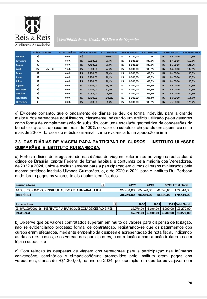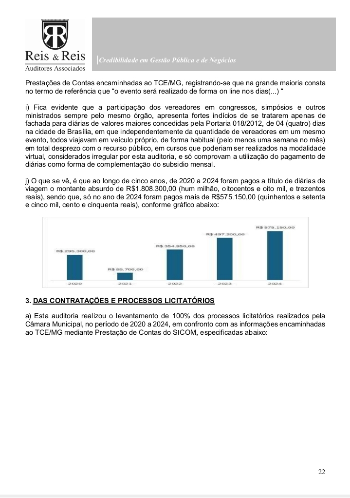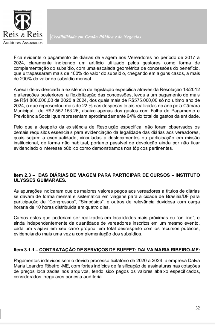 O documento, elaborado pela empresa Reis & Reis Auditores Associados, analisou atos entre 2020 e 2024 e detalhou o uso indevido de diárias parlamentares, além de inconsistências graves em contratações e controles internos.
