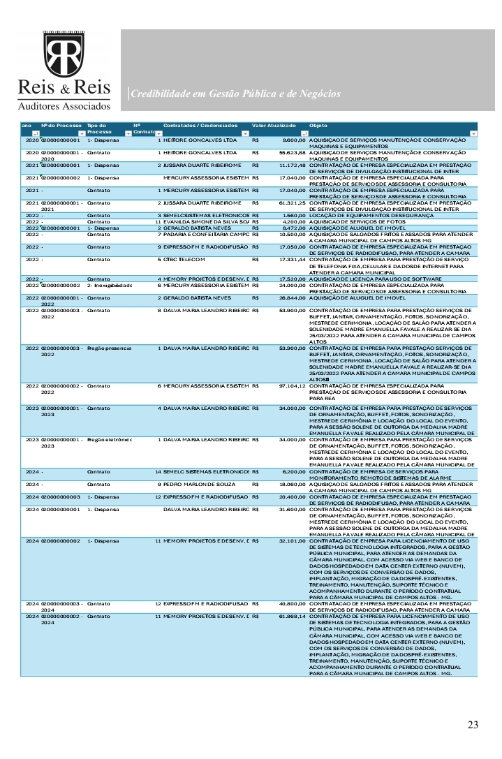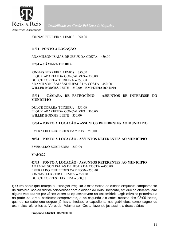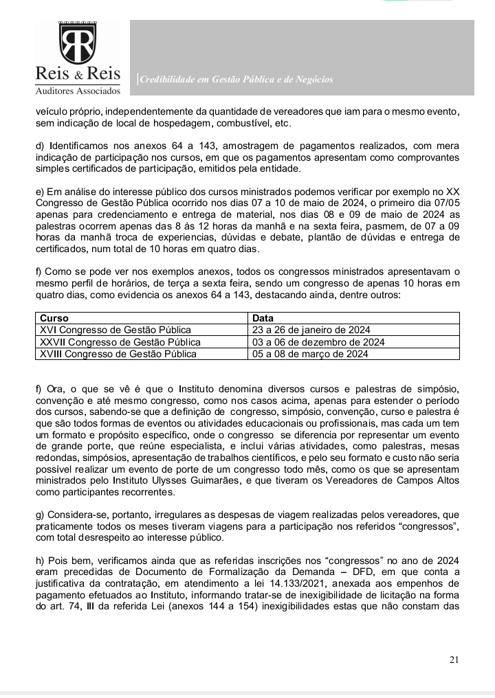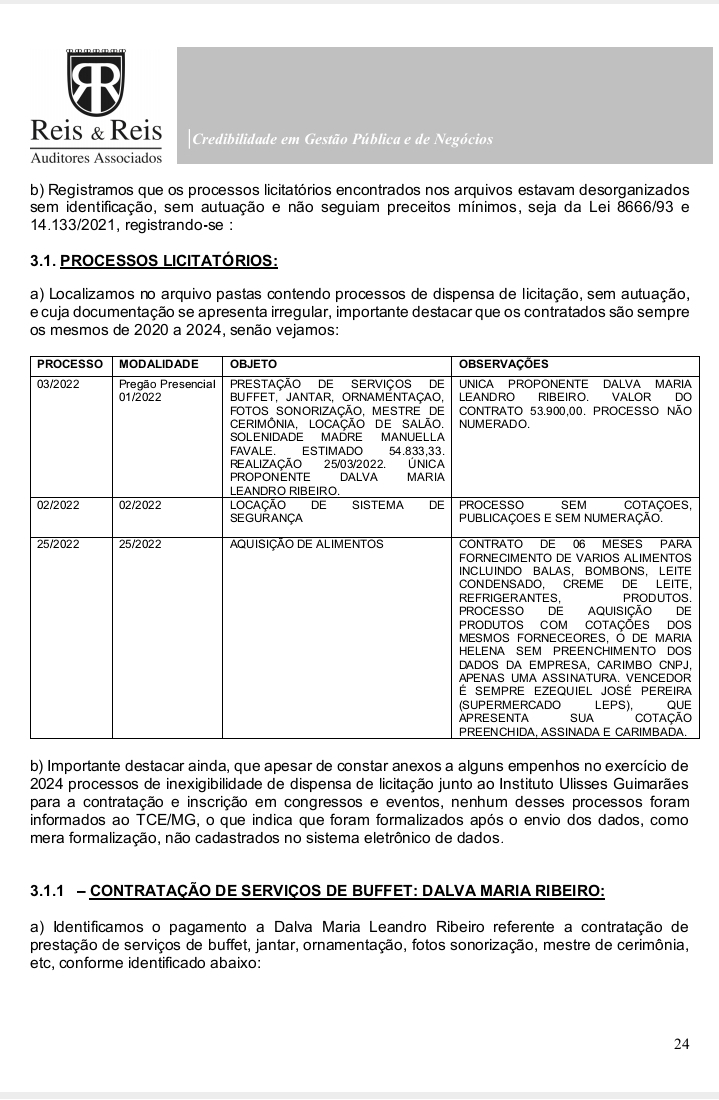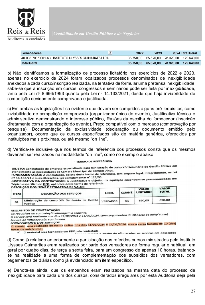 O documento, elaborado pela empresa Reis & Reis Auditores Associados, analisou atos entre 2020 e 2024 e detalhou o uso indevido de diárias parlamentares, além de inconsistências graves em contratações e controles internos.
