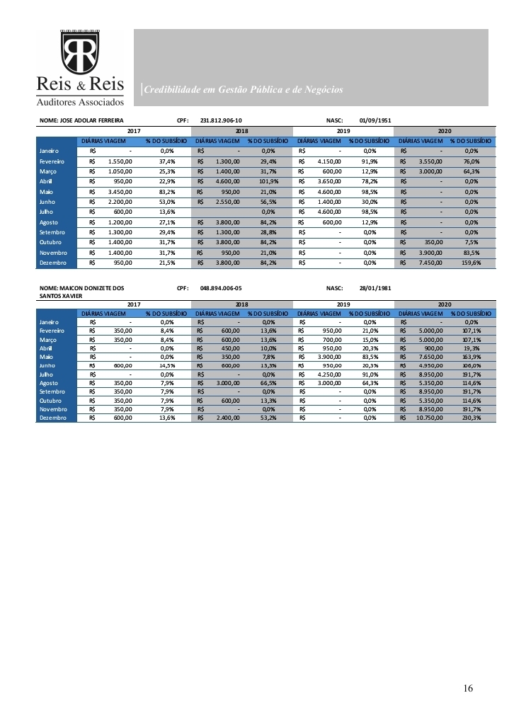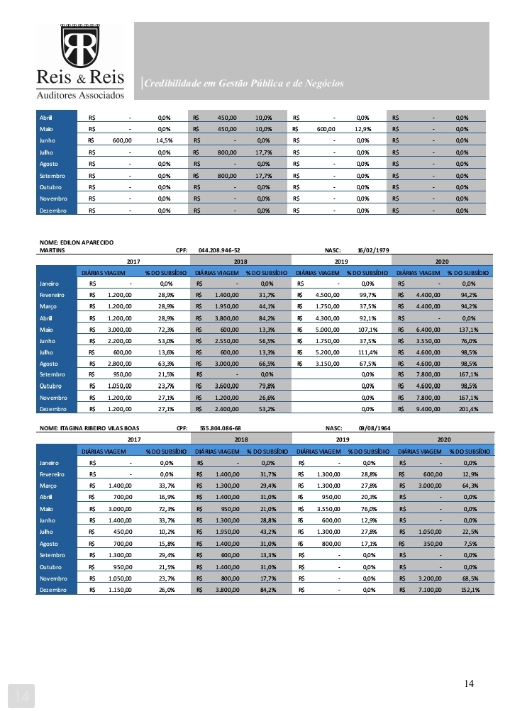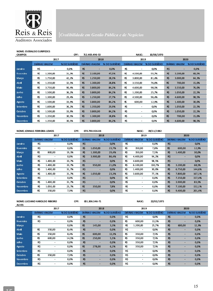 O documento registra meses em que os valores pagos superaram 100% do salário parlamentar e situações em que ultrapassaram 200%, padrão que se repetiu em diferentes exercícios financeiros. Para a auditoria, a constância dos pagamentos afasta a tese de erro isolado ou excepcional.