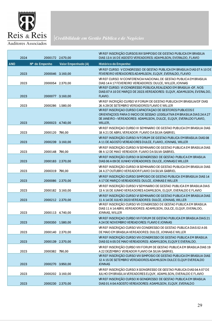 Outro eixo sensível envolve viagens recorrentes a Brasília para cursos e capacitações. A auditoria identificou repasses superiores a R$ 200 mil a duas instituições específicas, o Instituto Ulysses Guimarães e o Instituto Rui Barbosa.