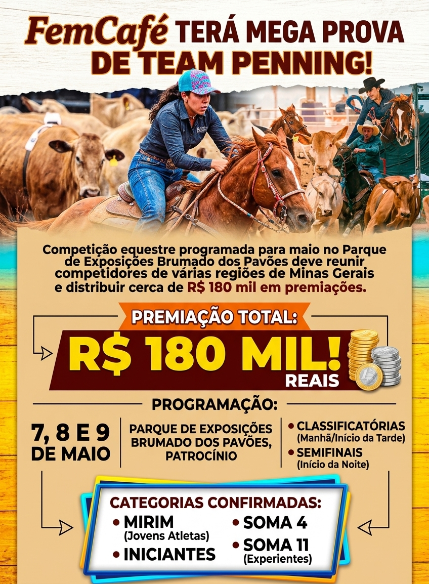 A programação da FemCafé 2026 incluirá uma das maiores provas de Team Penning de Minas Gerais. A competição está marcada para os dias 7, 8 e 9 de maio no Parque de Exposições Brumado dos Pavões, em Patrocínio.