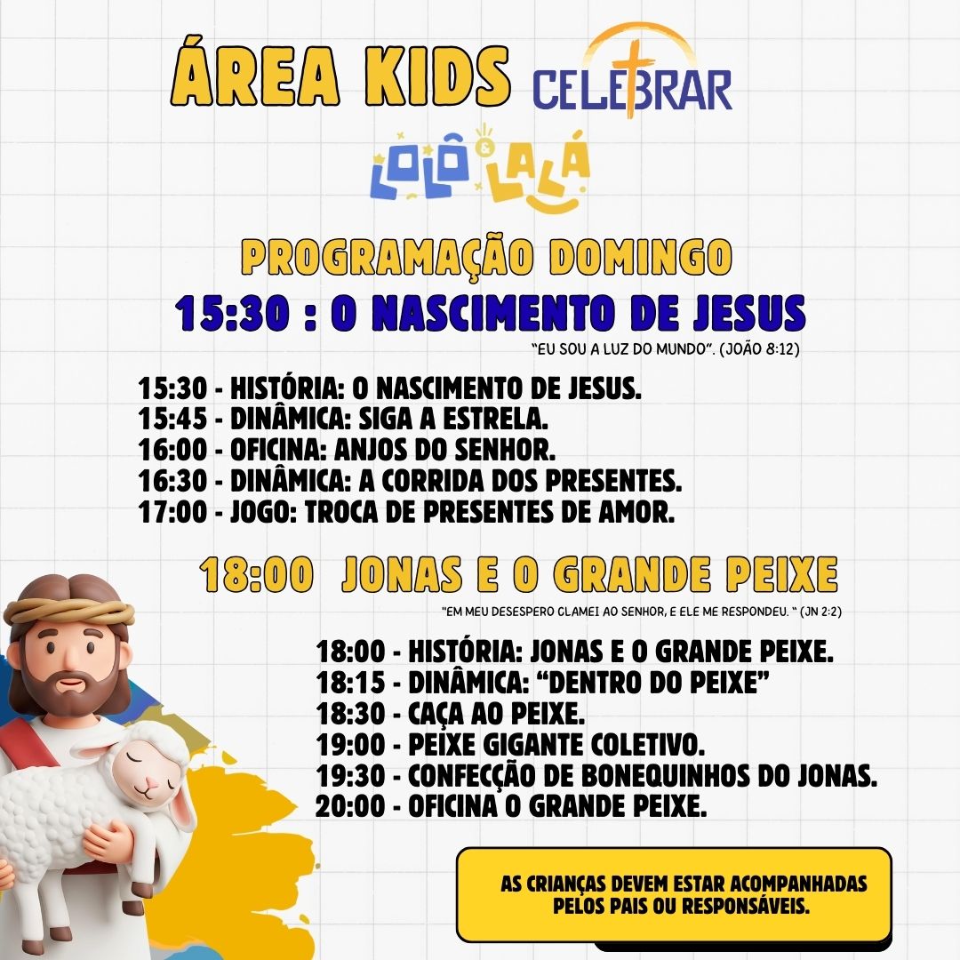Os organizadores convidam as famílias a acompanharem a programação completa e a levarem as crianças para participar de momentos de oração, música e atividades educativas.