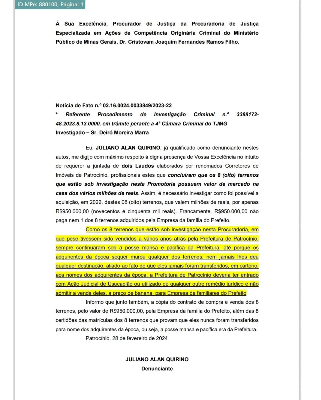Prefeito de Patrocínio envolvido em investigação de corrupção: procuração falsificada foi usada para aquisição de terrenos na Avenida General Astolfo, segundo depoimentos e provas apresentadas pelo GAECO e Procuradoria de Crimes contra Prefeitos