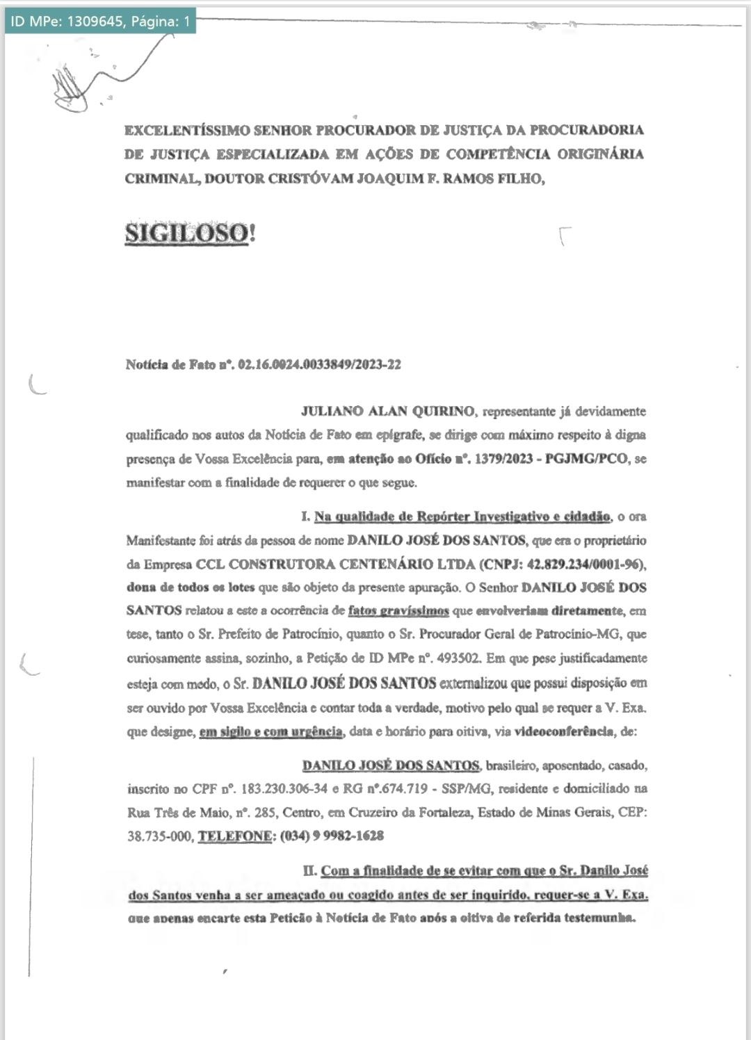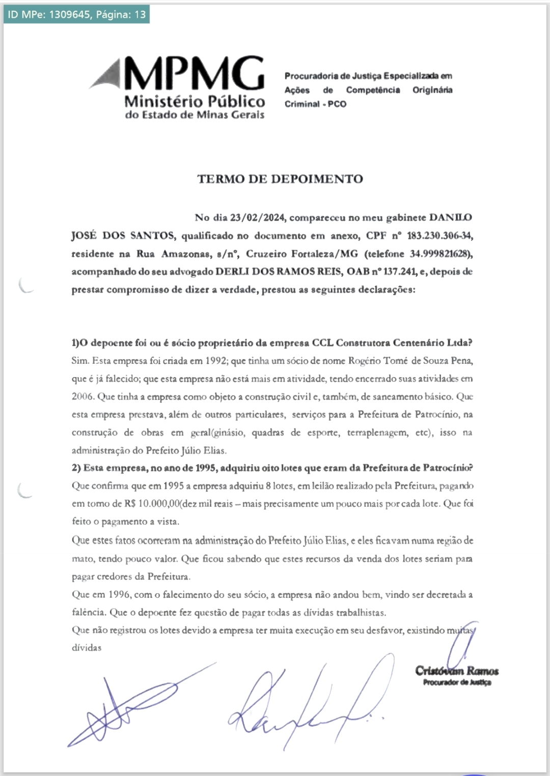 Danilo relatou também que assinou documentos em 2022, incluindo uma procuração falsificada, com data retroativa a 2006, que concedia a ele poderes para vender os lotes.