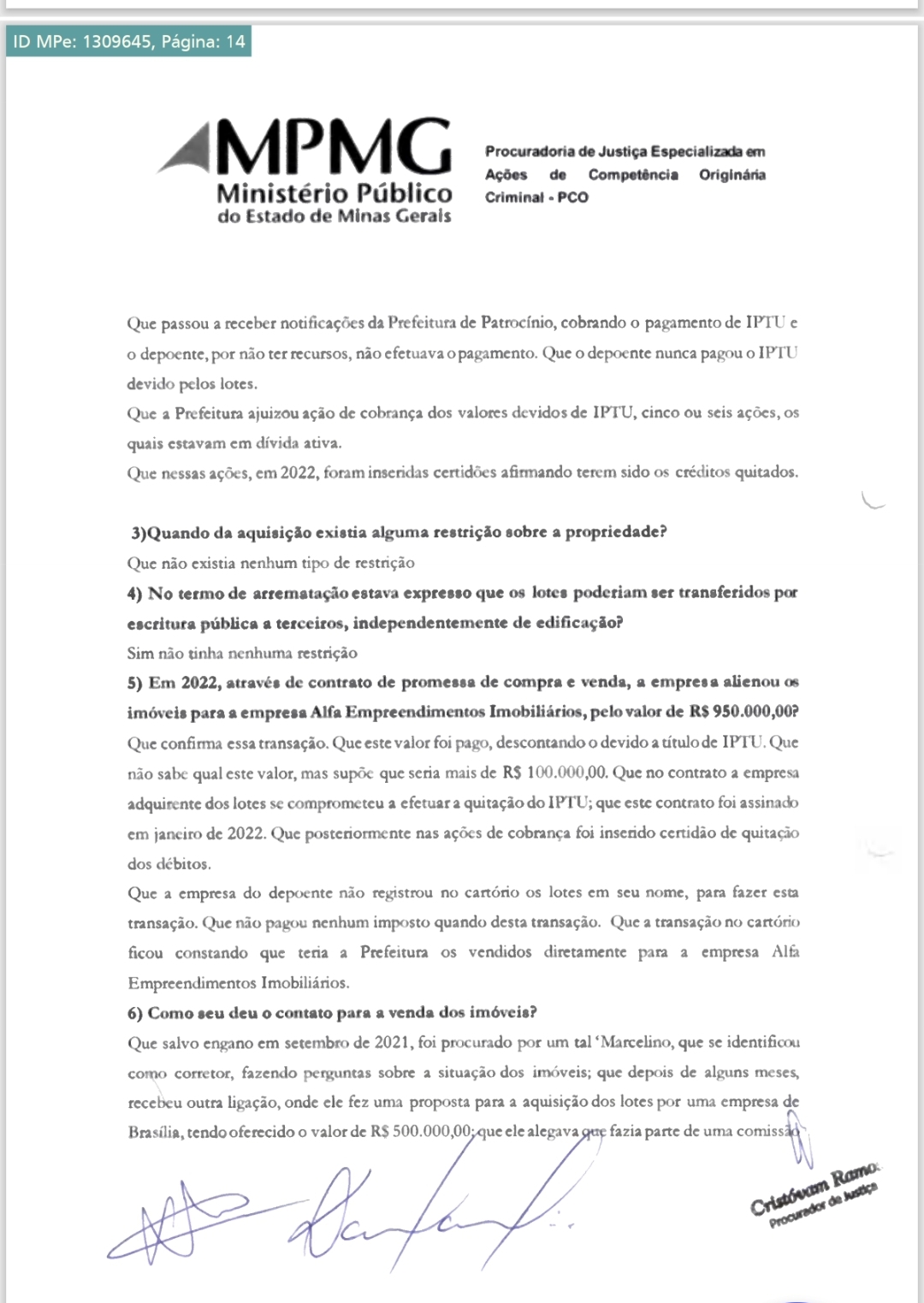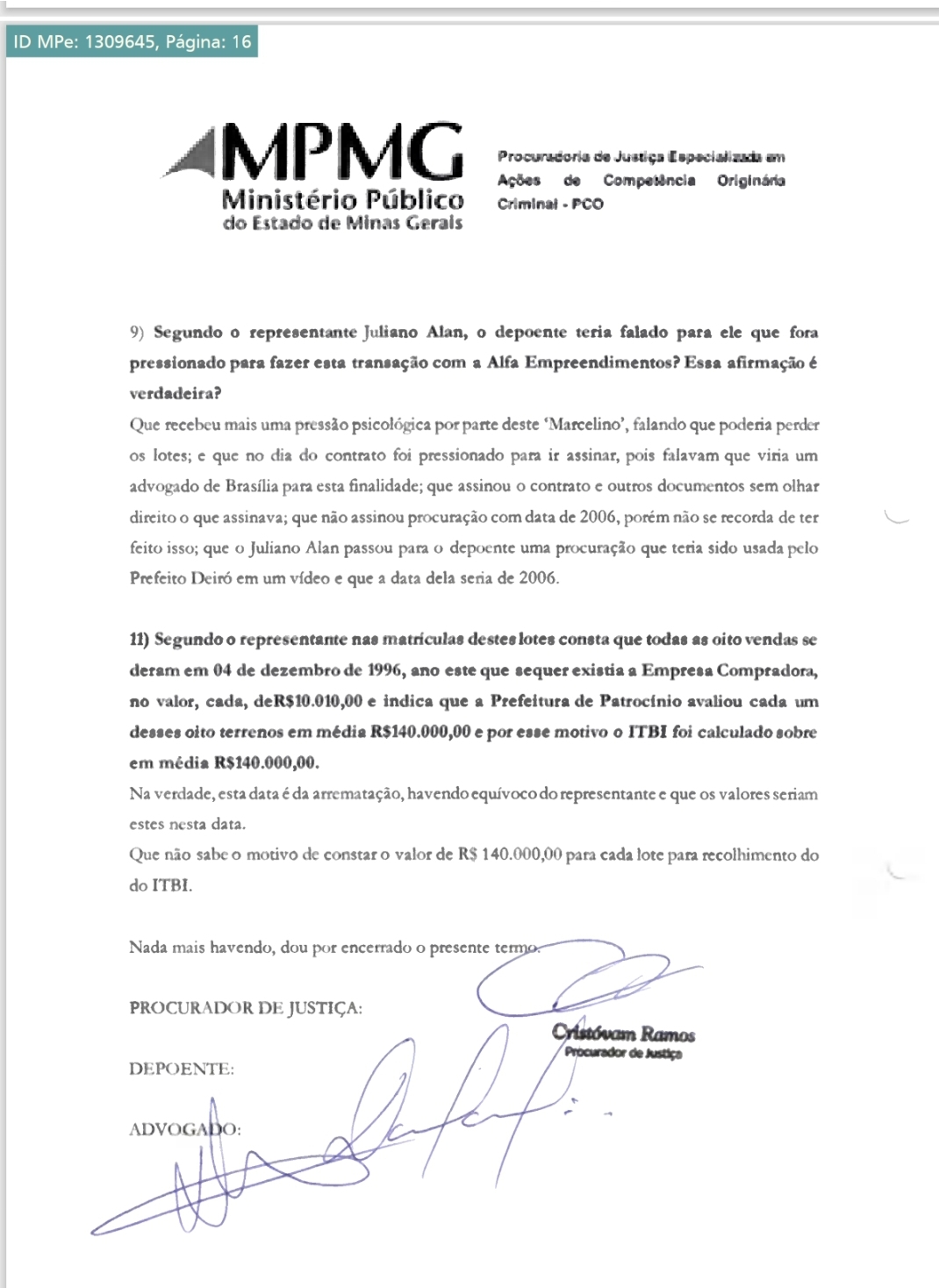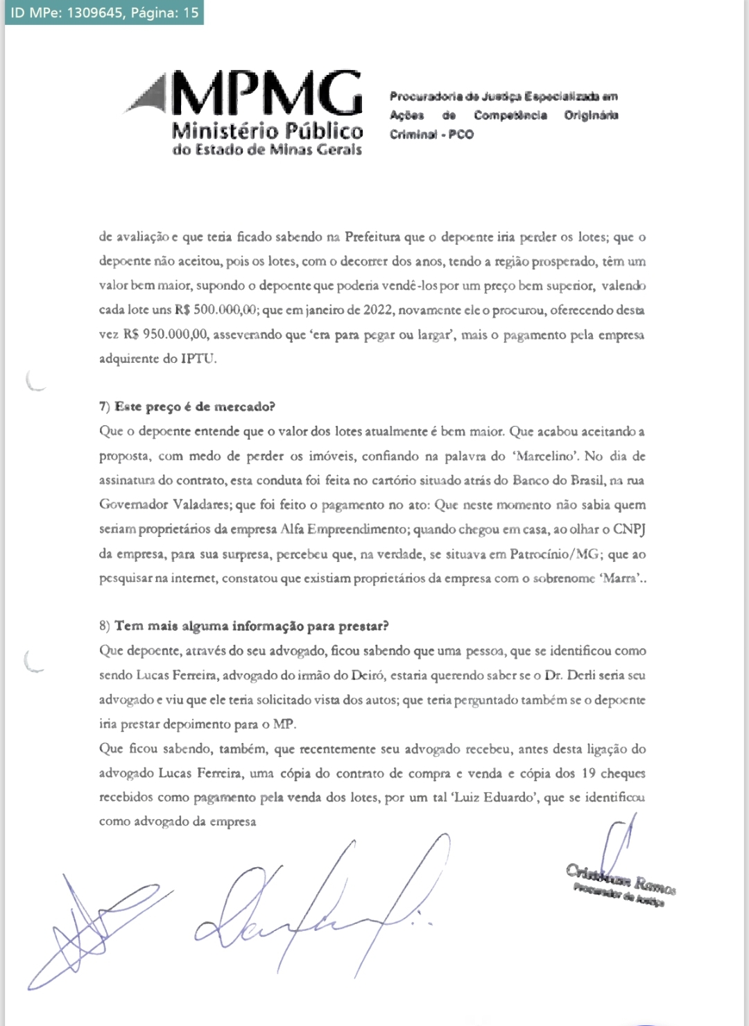 Em depoimento ao Procurador de Justiça, Dr. Cristovam Joaquim F. Ramos Filho, o ex-proprietário dos terrenos, Sr. Danilo Santos, afirmou ter sido pressionado pelo corretor Marcelino a vender as propriedades por um valor muito abaixo do mercado.