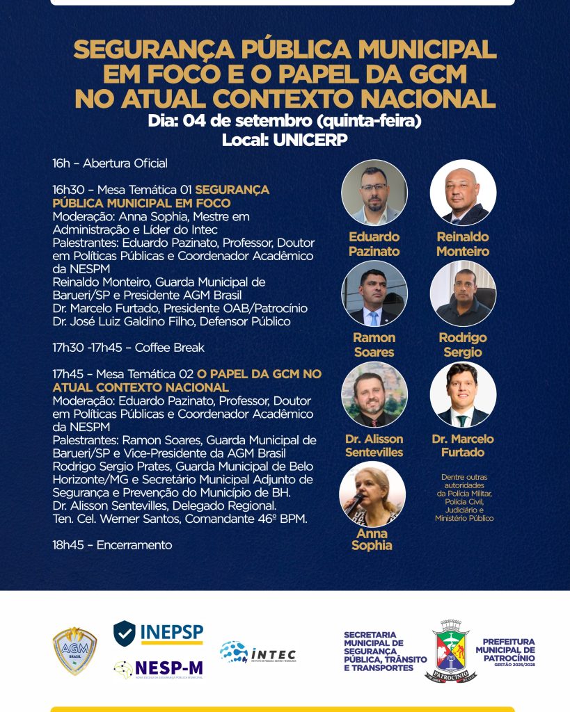 A Prefeitura de Patrocínio, por meio da Secretaria Municipal de Segurança Pública, Trânsito e Transportes, convida a população, autoridades e profissionais da área para participar do evento “Segurança Pública Municipal em Foco e o Papel da GCM no Atual Contexto Nacional”. O encontro será realizado no dia 4 de setembro, quinta-feira, a partir das 16h, no UNICERP.