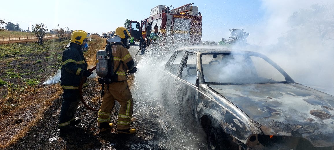 Motorista conseguiu sair a tempo do carro em chamas; Corpo de Bombeiros agiu rápido, mas veículo foi completamente destruído no trecho da BR-365, em Patrocínio.