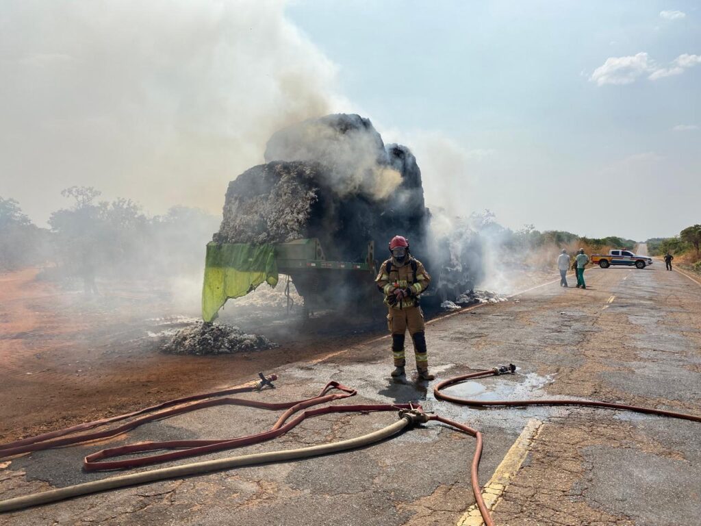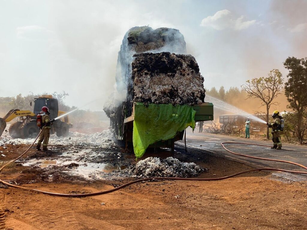Incêndio em carreta carregada com algodão destrói 22 toneladas da carga, bloqueia a MG-188 por mais de quatro horas e mobiliza bombeiros e maquinário pesado para controle das chamas