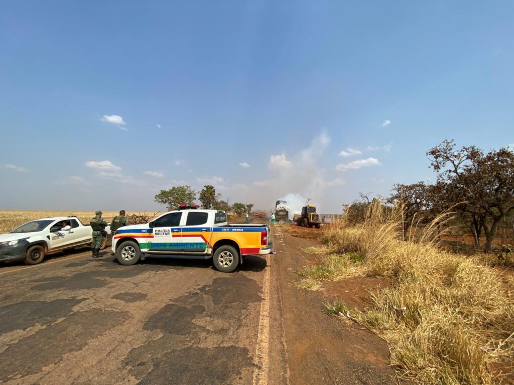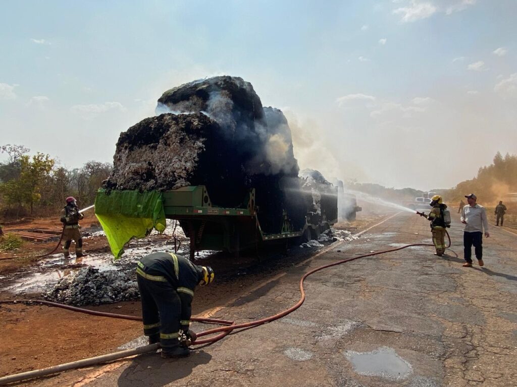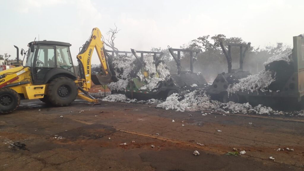 Incêndio em carreta carregada com algodão destrói 22 toneladas da carga, bloqueia a MG-188 por mais de quatro horas e mobiliza bombeiros e maquinário pesado para controle das chamas