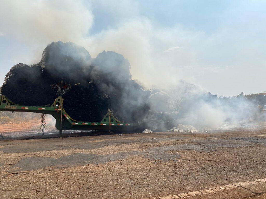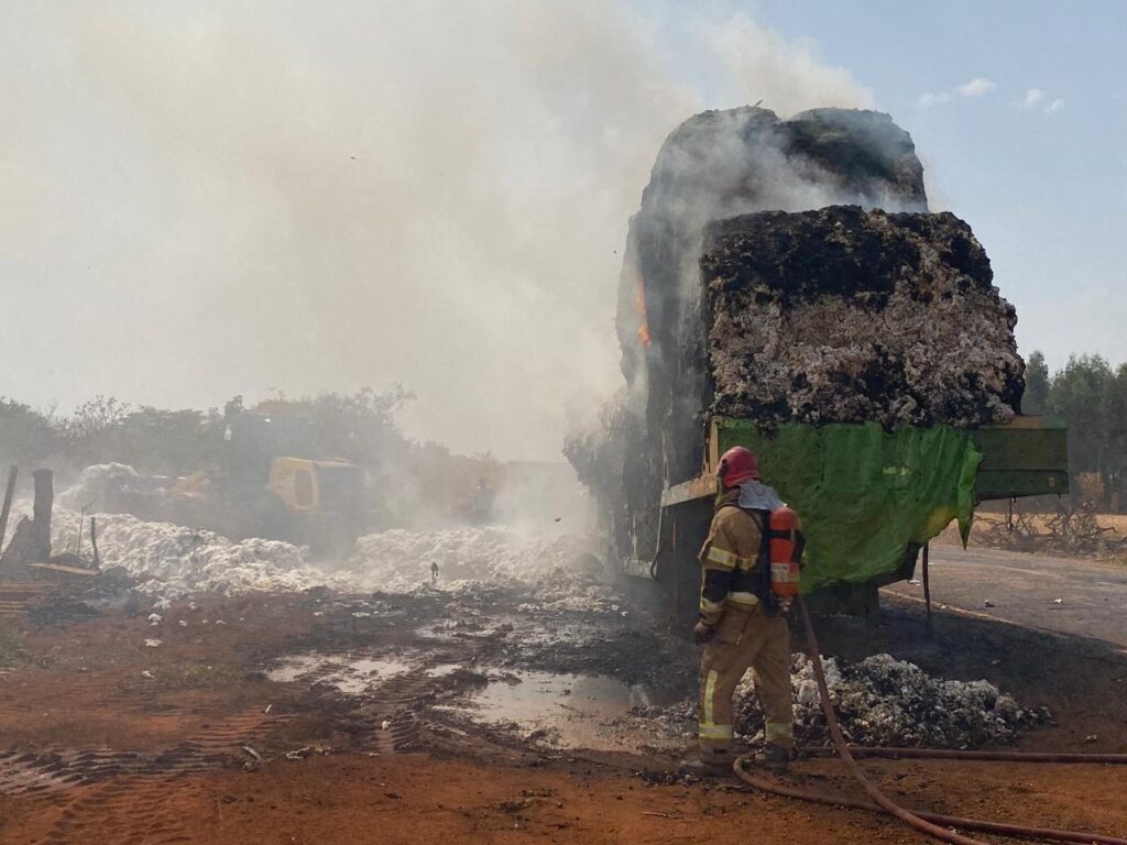 Na manhã desta quarta-feira (18), por volta das 10h22, o Corpo de Bombeiros do 5º Pelotão de Patrocínio foi acionado para conter um incêndio em uma carreta carregada com fardos de algodão, cada um pesando aproximadamente 2.500 kg, na rodovia MG-188, próximo ao KM 366, sentido Patos de Minas.