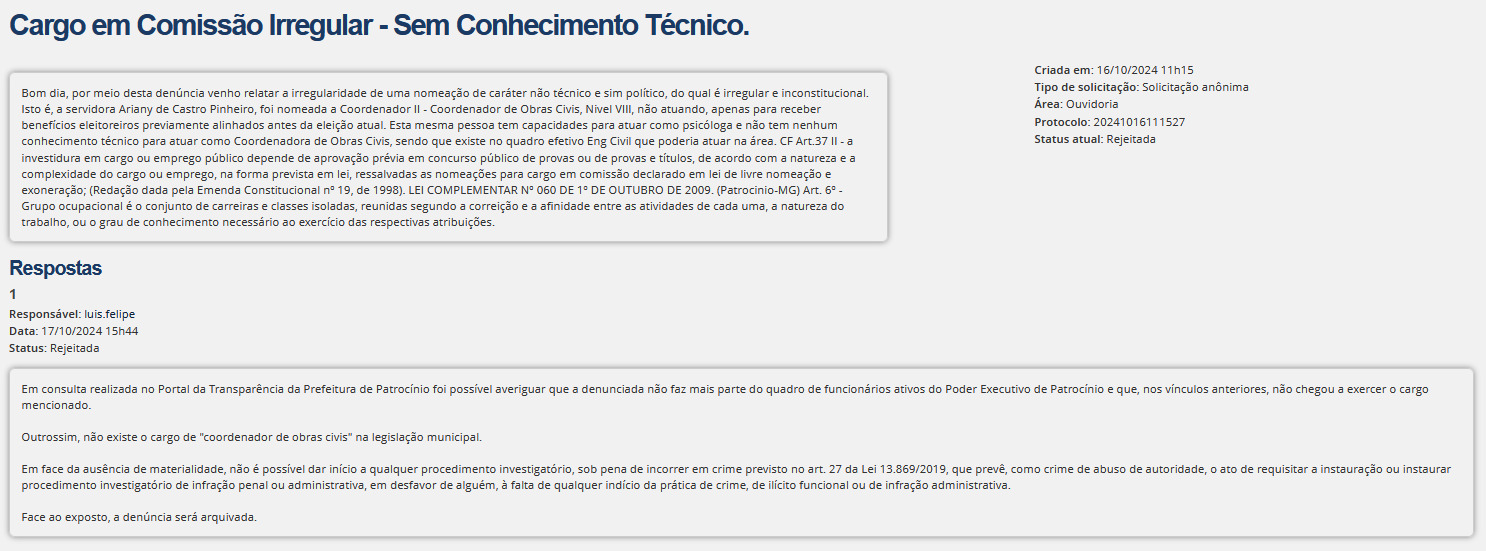 Venho, por meio desta, formalizar denúncia em face da nomeação irregular de caráter político da servidora Ariany de Castro Pinheiro para o cargo de Coordenador II – Coordenador de Obras Civis, Nível VIII.