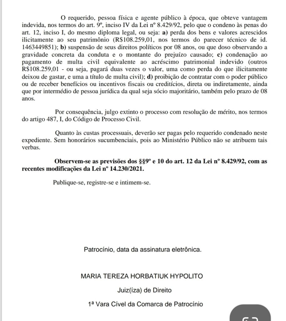 A sentença, proferida pela juíza Maria Tereza Horbatiuk Hypolito, determinou que ele ressarça o valor dos “favores” que fez a si mesmo.