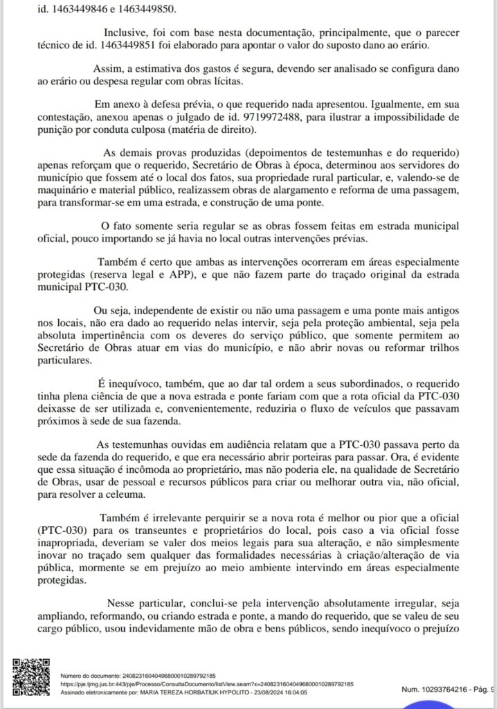 A sentença, proferida pela juíza Maria Tereza Horbatiuk Hypolito, determinou que ele ressarça o valor dos “favores” que fez a si mesmo.