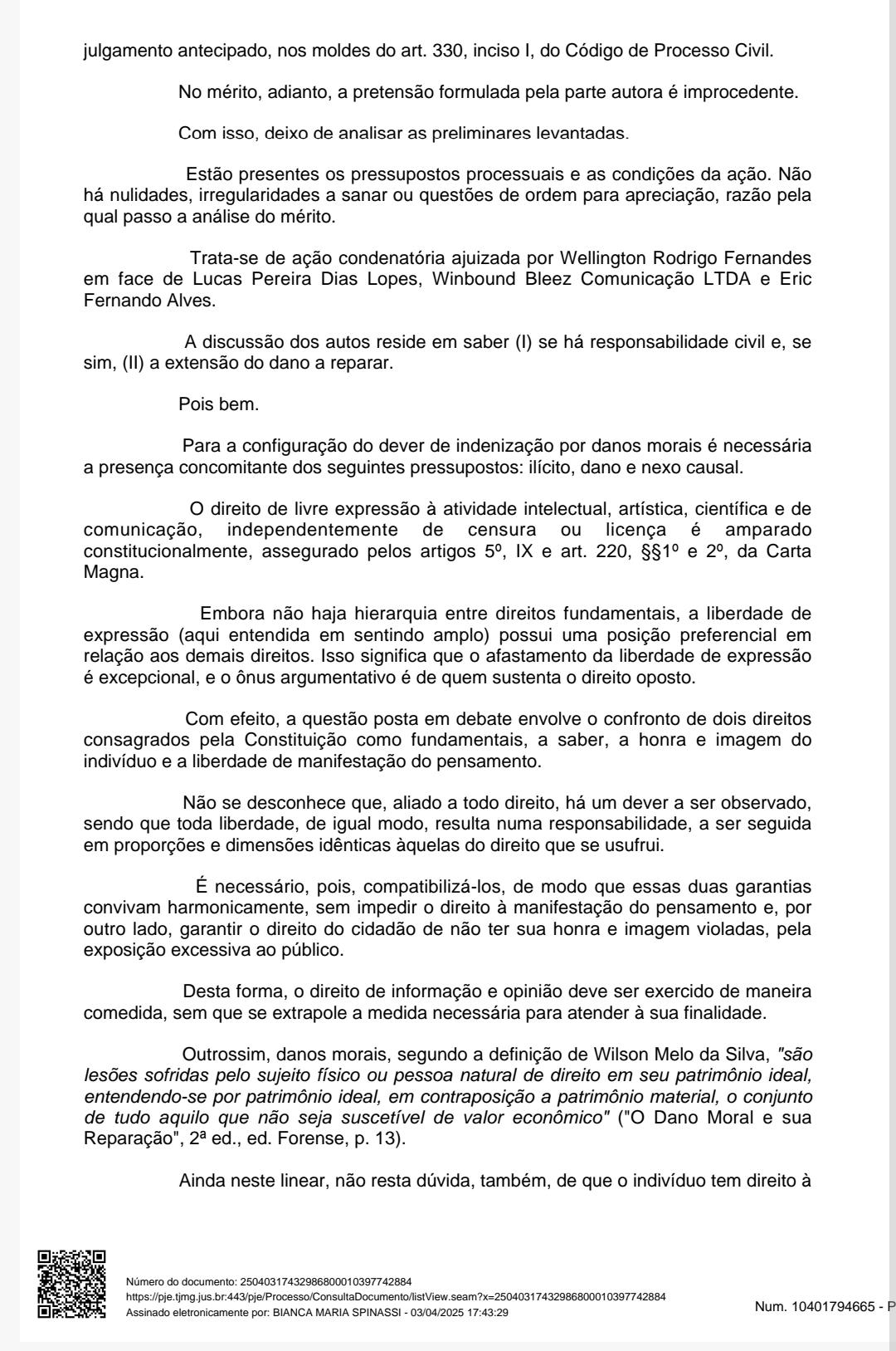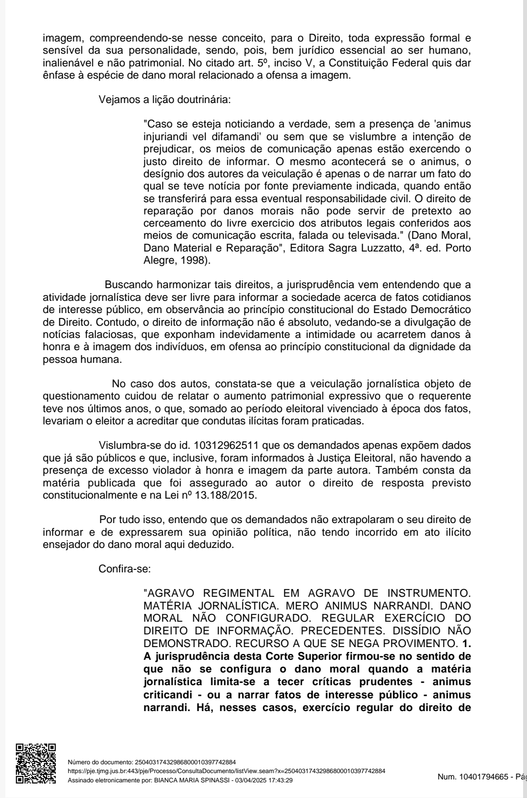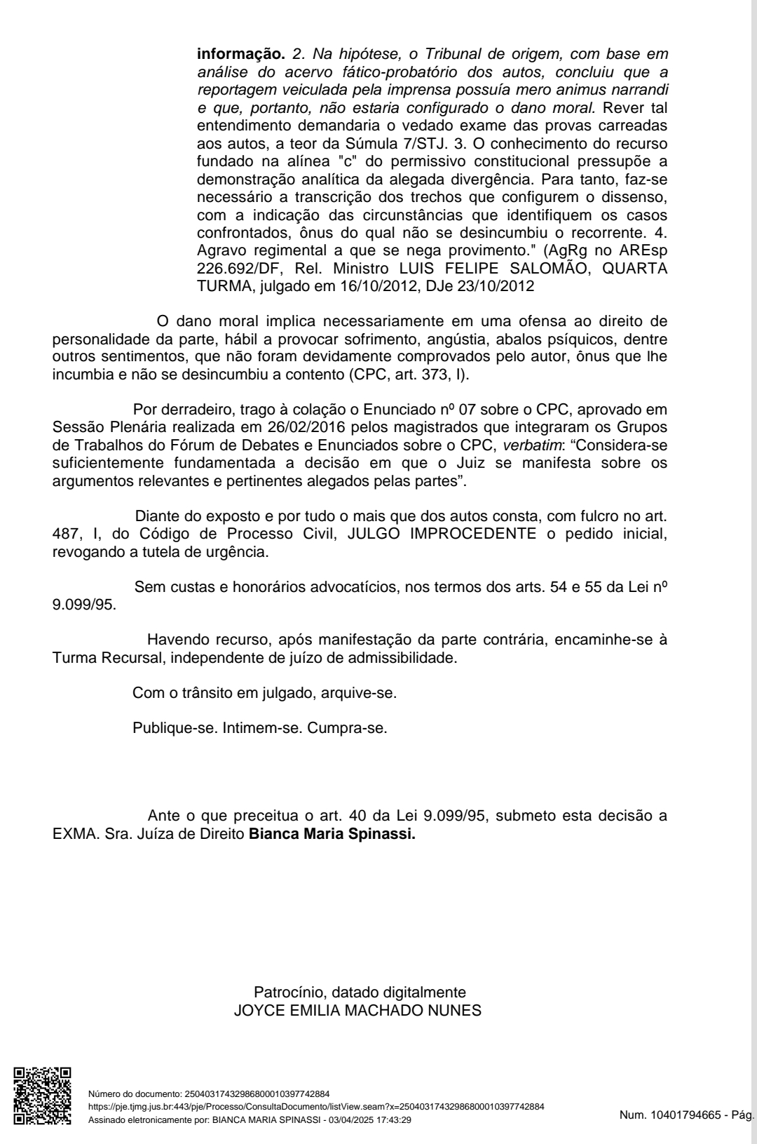 A juíza leiga Joyce Emília Machado Nunes, com a homologação da juíza Bianca Maria Spinassi, afirmou que não houve qualquer comprovação de sofrimento ou abalo emocional causado pelo jornal. Segundo ela, cabe a quem entra com o processo apresentar as provas, o que não aconteceu nesse caso.