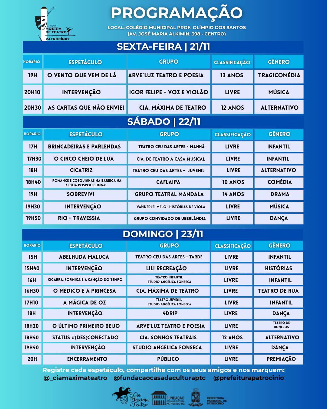 A XI Mostra de Teatro de Patrocínio vai movimentar o cenário cultural do município entre os dias 21 e 23 de novembro, com uma programação que reúne 18 apresentações de diferentes formatos e faixas etárias. Os espetáculos serão apresentados no auditório do Colégio Municipal Professor Olímpio dos Santos, no Centro, com entrada gratuita.