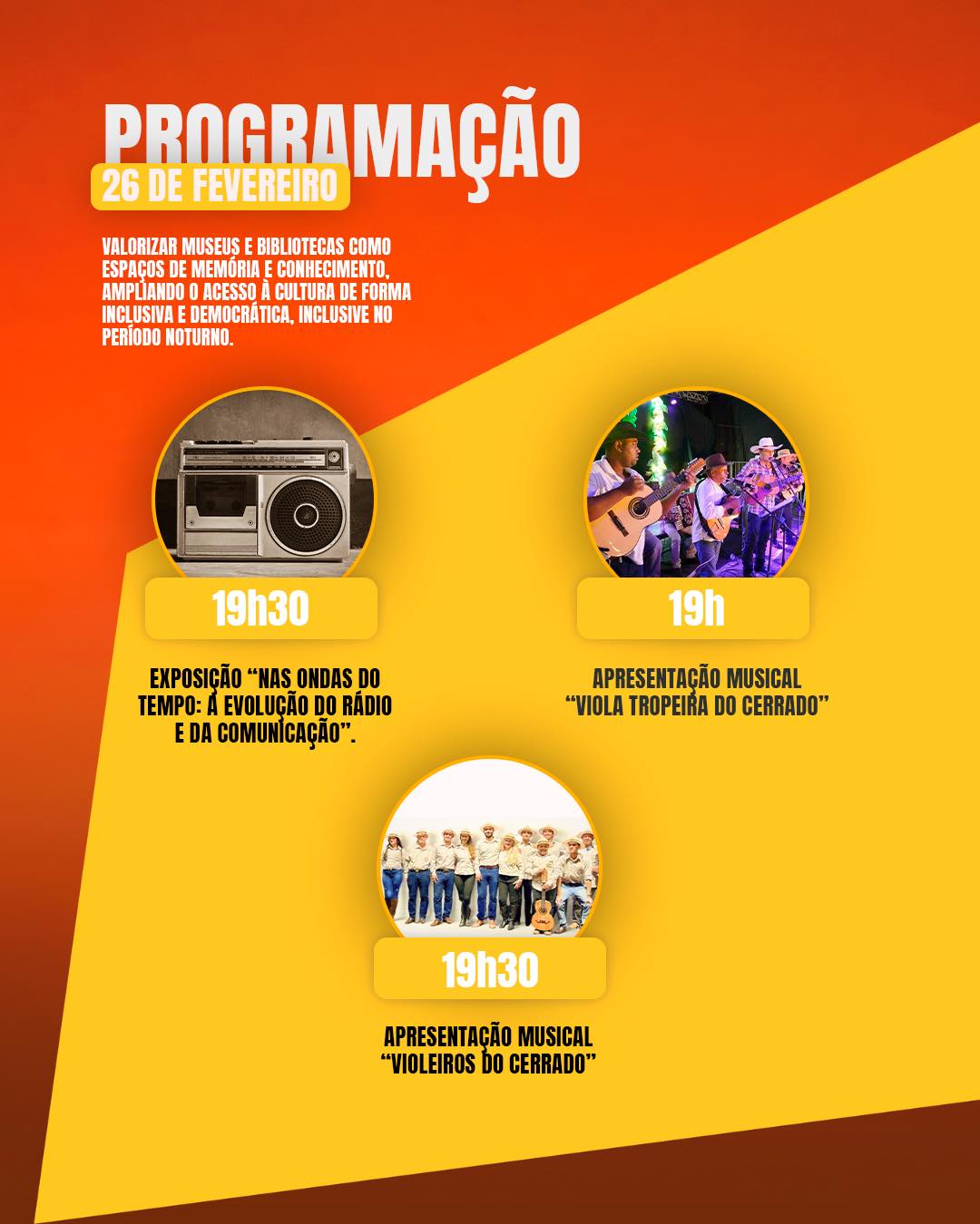 Na área externa, a partir das 19h, a Esplanada do Museu recebe apresentações musicais que destacam a tradição da viola caipira. O grupo Viola Tropeira do Cerrado inicia as atividades, seguido, às 19h30, pelos Violeiros do Cerrado. As apresentações buscam valorizar repertórios ligados à cultura mineira e às raízes sertanejas.