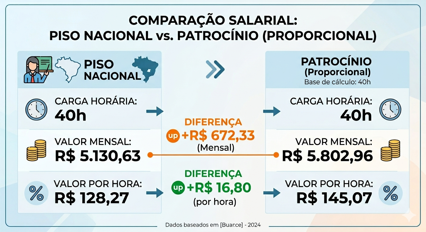 O piso nacional, fixado em R$ 5.130,63, vale para uma jornada de 40 horas semanais. Em Patrocínio, os professores regentes trabalham 27 horas-relógio por semana e recebem vencimento inicial de R$ 3.917,00. Feita a proporcionalização prevista pela própria Lei do Piso Nacional do Magistério — a Lei Federal nº 11.738/2008 —, o valor equivalente a 40 horas chega a R$ 5.802,96. Patrocínio não está abaixo do piso. Está R$ 672,33 acima dele.