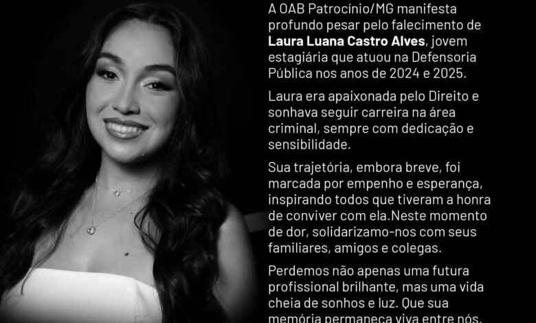 A subseção da OAB Patrocínio divulgou nota de pesar pela morte de Laura Luana Castro Alves, estagiária que integrou a equipe da Defensoria Pública entre 2024 e 2025. A entidade destacou o comprometimento da jovem com a formação jurídica e sua intenção declarada de atuar no campo do Direito Penal.