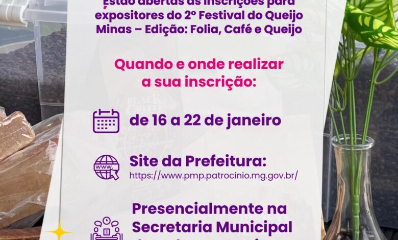 A Prefeitura de Patrocínio publicou o edital do 2º Festival do Queijo Minas – edição “Folia, Café e Queijo” e abriu o período de inscrições para expositores interessados em participar do evento, marcado para os dias 14 e 15 de fevereiro, na Praça Monsenhor Tiago, em frente à Matriz.