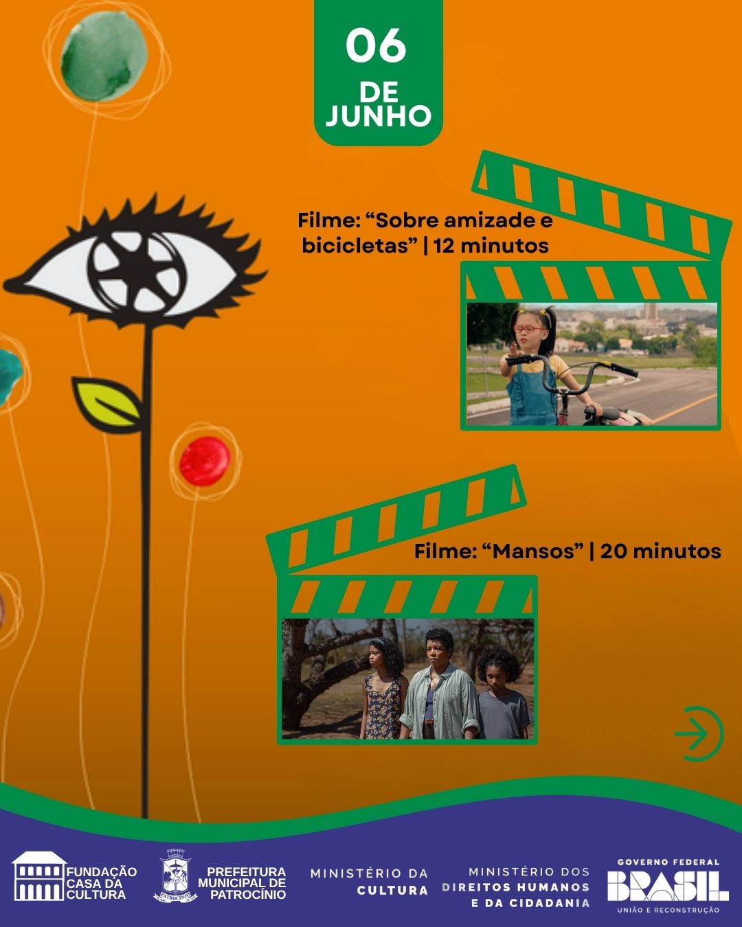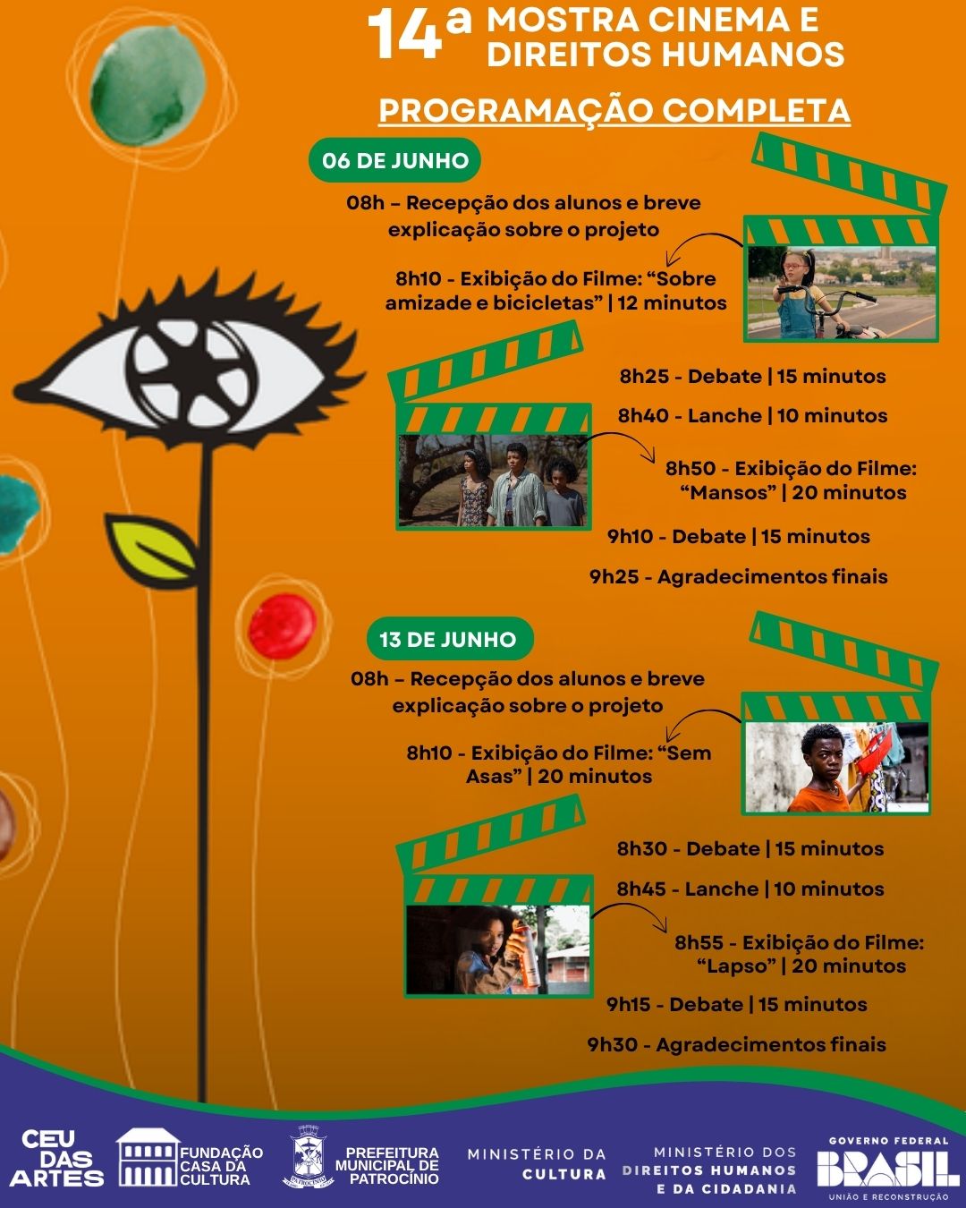 A cidade de Patrocínio participa da 14ª edição da Mostra Cinema e Direitos Humanos, iniciativa nacional promovida pelo Ministério dos Direitos Humanos e da Cidadania (MDHC) em parceria com o Ministério da Cultura (MinC). As sessões ocorrem nos dias 6 e 13 de junho no CEU das Artes, com entrada gratuita e programação direcionada a estudantes da rede pública.