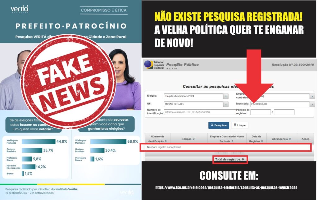A pesquisa não só apresenta números que não batem com a realidade, como também não tem nenhum registro no Tribunal Regional Eleitoral (TRE), o que já mostra que se trata de uma grande mentira.