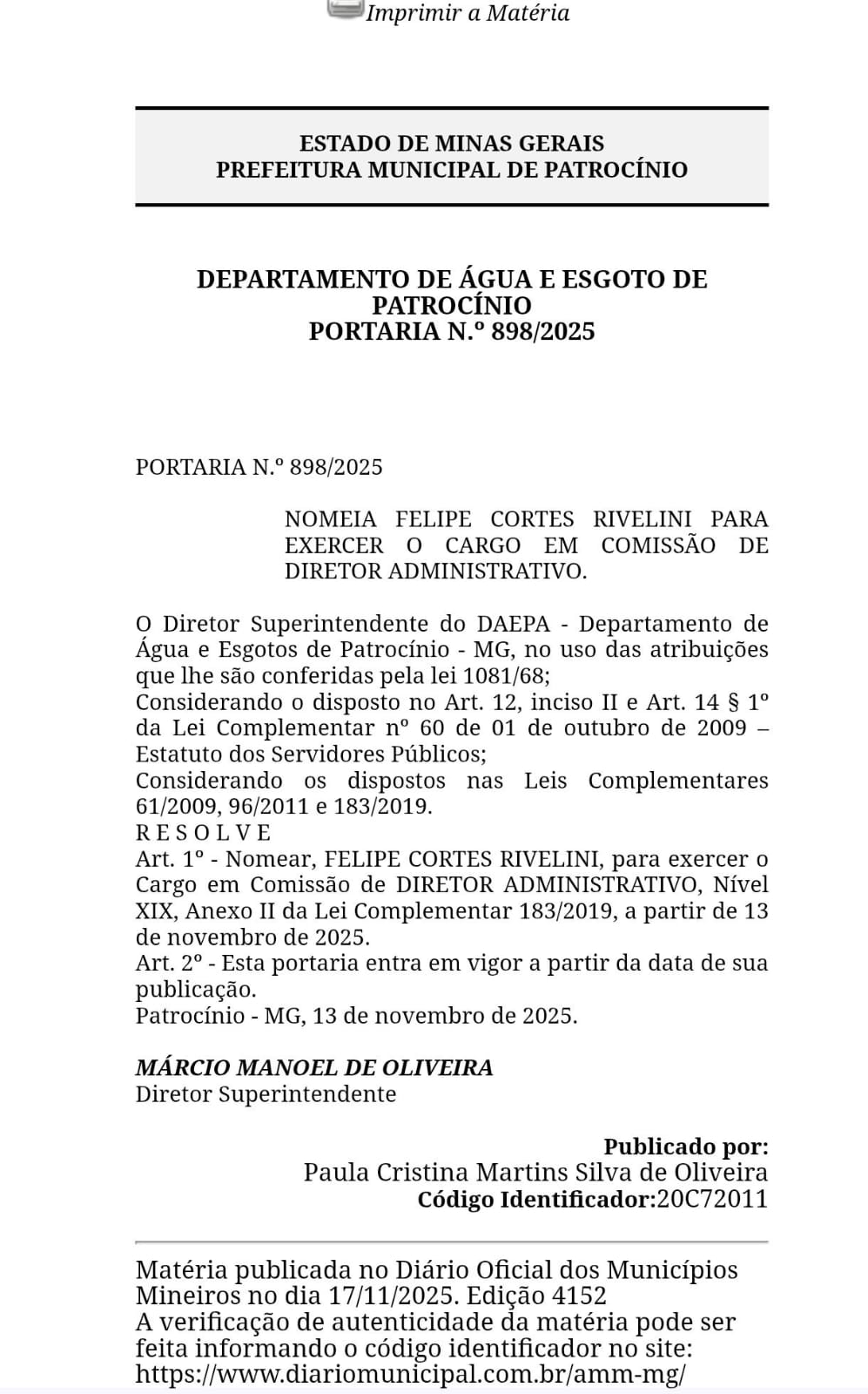 A Prefeitura de Patrocínio oficializou, nesta segunda-feira (17), a nomeação de Felipe Cortes Riveline para o cargo em comissão de diretor administrativo do Departamento de Água e Esgoto de Patrocínio (DAEPA). A portaria, assinada pelo diretor-superintendente Márcio Manoel de Oliveira, foi publicada no Diário Oficial dos Municípios Mineiros e confirma a escolha encaminhada na última quarta-feira (12).