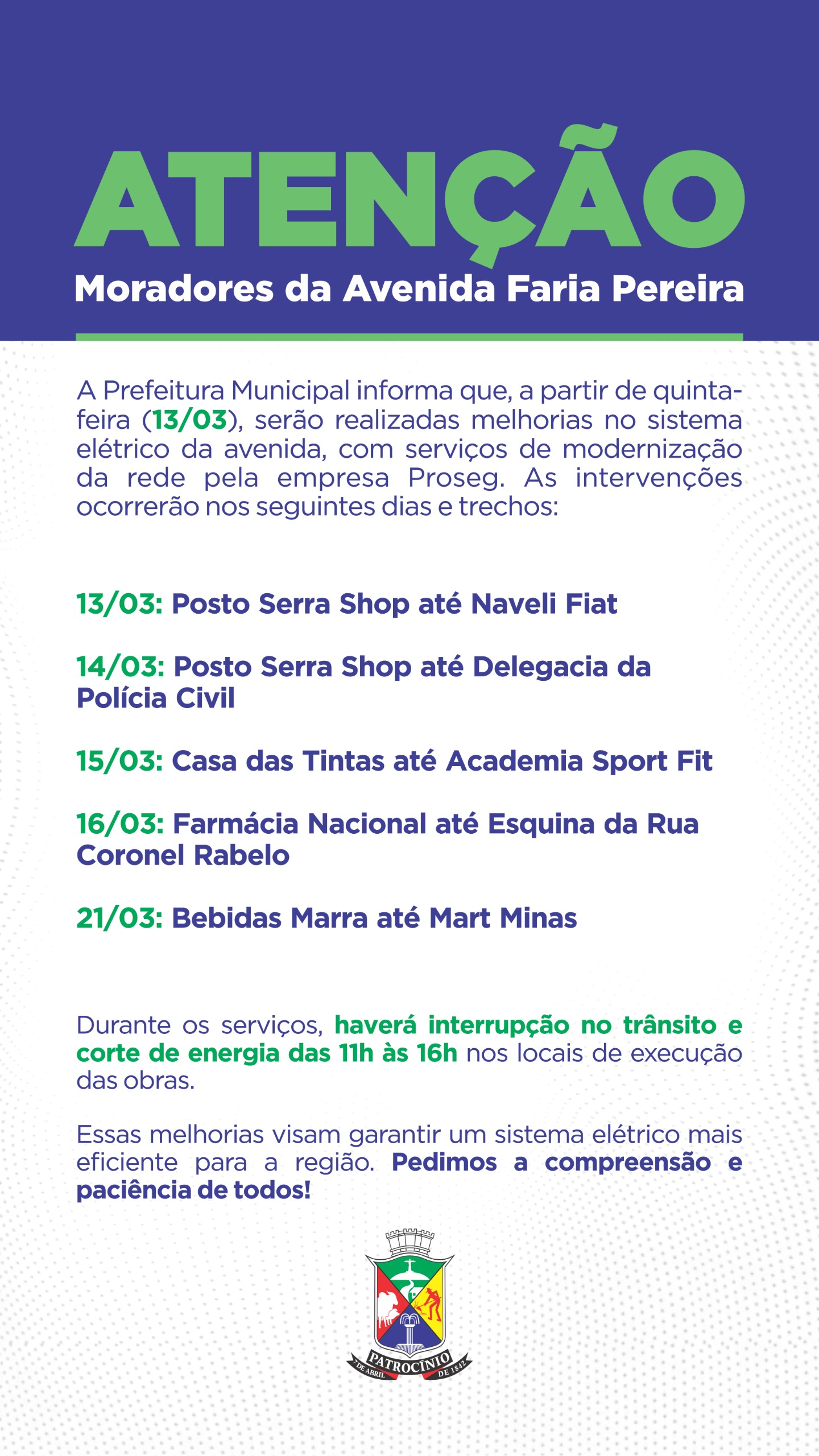 A Prefeitura de Patrocínio divulgou que realizará melhorias no sistema elétrico da Avenida Faria Pereira, com serviços de modernização da rede conduzidos pela empresa Proseg.