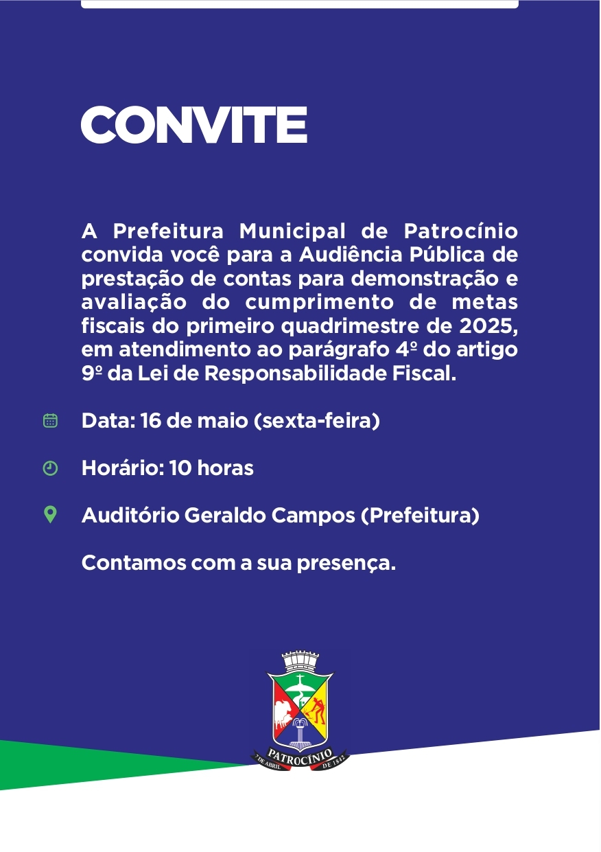 A Prefeitura de Patrocínio realiza nesta sexta-feira (16) uma Audiência Pública de Prestação de Contas, aberta à participação de toda a comunidade. O objetivo do encontro é apresentar o cumprimento das metas fiscais relativas ao primeiro quadrimestre de 2025, conforme determina o §4º do Art. 9º da Lei de Responsabilidade Fiscal (LRF).