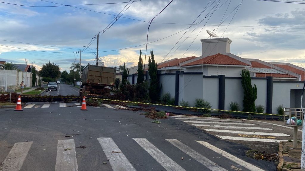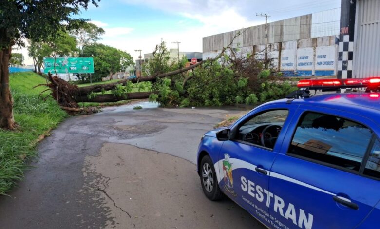 Chuva intensa com ventos fortes derruba árvores, postes e fiação, provoca interdições e leva município a acionar Defesa Civil, forças de segurança e concessionárias.