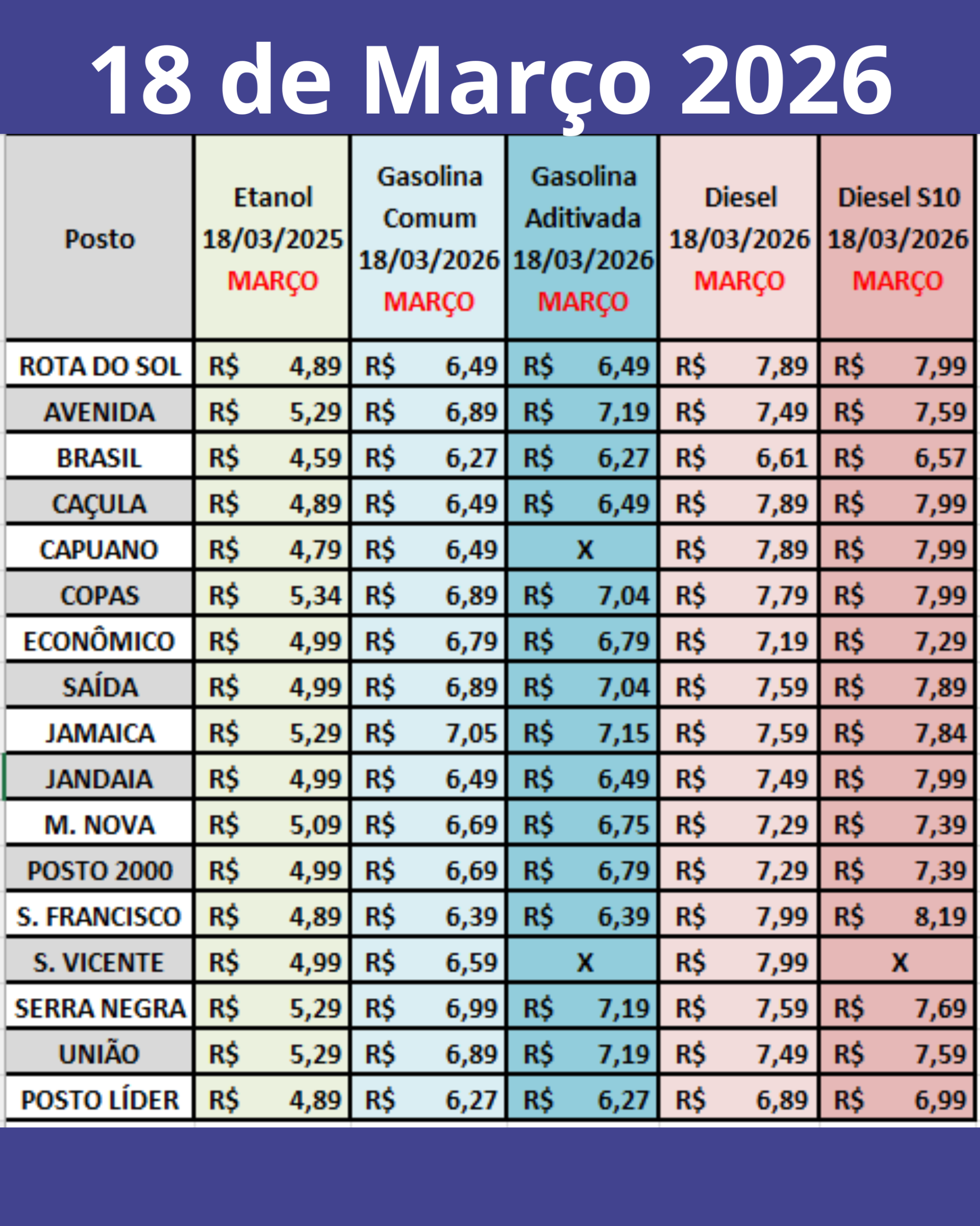 A gasolina aditivada seguiu o mesmo padrão. Brasil e Posto Líder mantiveram os preços mais competitivos, também a R$ 6,27, enquanto Serra Negra, União e Avenida registraram R$ 7,19 o litro. Dois postos — Capuano e S. Vicente — não disponibilizaram o produto na data da pesquisa.
