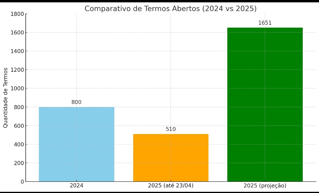 Com esse ritmo, a projeção aponta para cerca de 1.651 termos abertos até o fim de 2025, o que representa um crescimento de 106,5% em relação ao mesmo período do ano anterior.