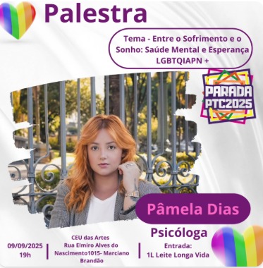 O CEU das Artes, em Patrocínio, recebe no dia 9 de setembro, às 19h, a palestra “Entre o Sofrimento e o Sonho: Saúde Mental e Esperança LGBTQIAPN+”, ministrada pela psicóloga e psicanalista Pâmela Dias. A entrada consiste na doação de 1 litro de leite longa vida, que será destinado ao Hospital do Amor e ao Núcleo Espírita Chico Xavier.