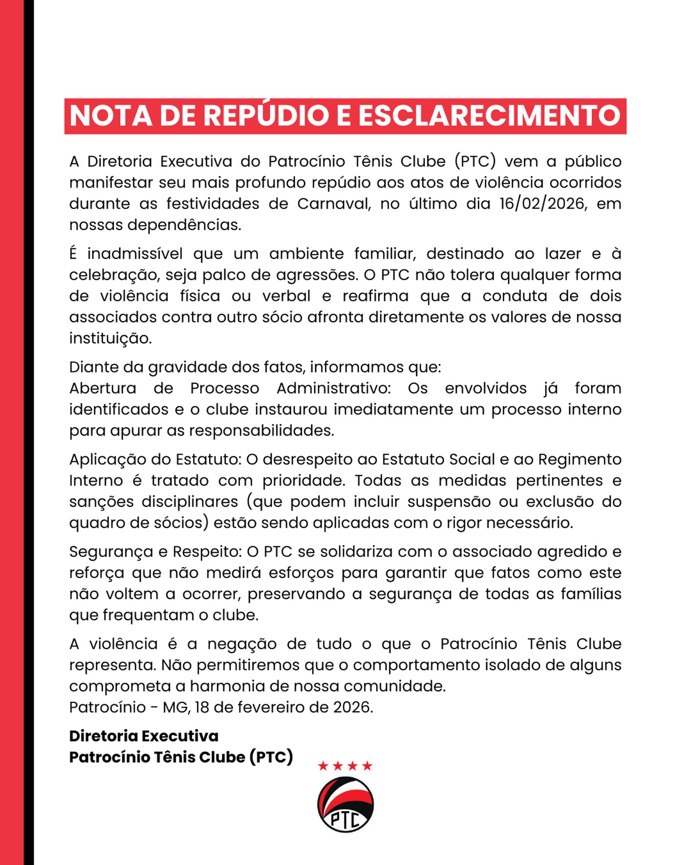 Em nota oficial, o clube repudiou o confronto e enfatizou que o comportamento de dois sócios contra um terceiro fere frontalmente o Estatuto Social da entidade. A gestão do PTC classificou as agressões — físicas e verbais — como um atentado aos valores de lazer e convivência familiar que norteiam o clube.